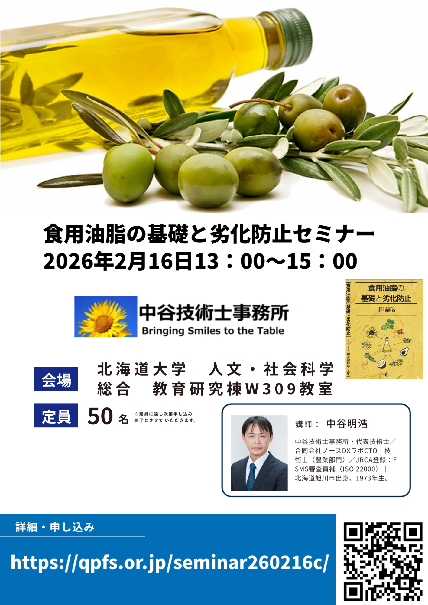 【セミナー】食用油脂の基礎と劣化防止【札幌開催】のお知らせ